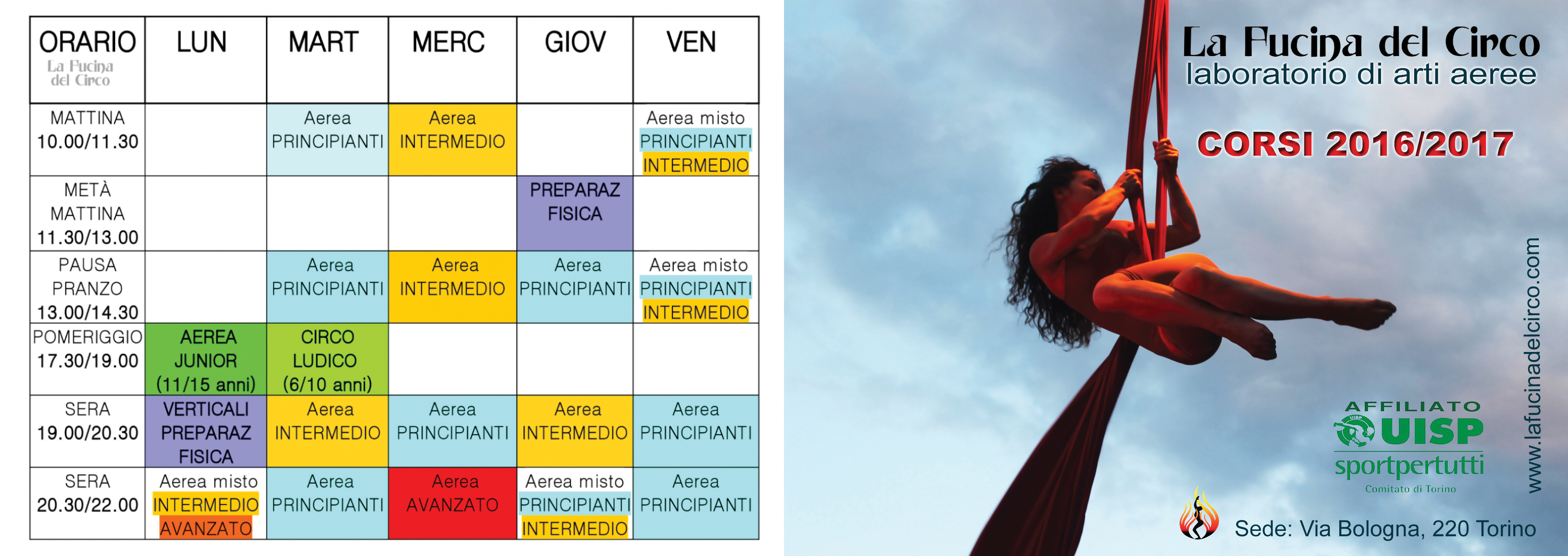 INIZO: 3 OTTOBRE 2016. Le iscrizioni sono aperte da luglio 2016 presso la nostra sede in Via Bologna 220 a Torino all’interno dell’EX LANIFICIO DI TORINO. Per info contattare via mail lafucinadelcirco@gmail.com o telefonando al 3382133867 Martina.