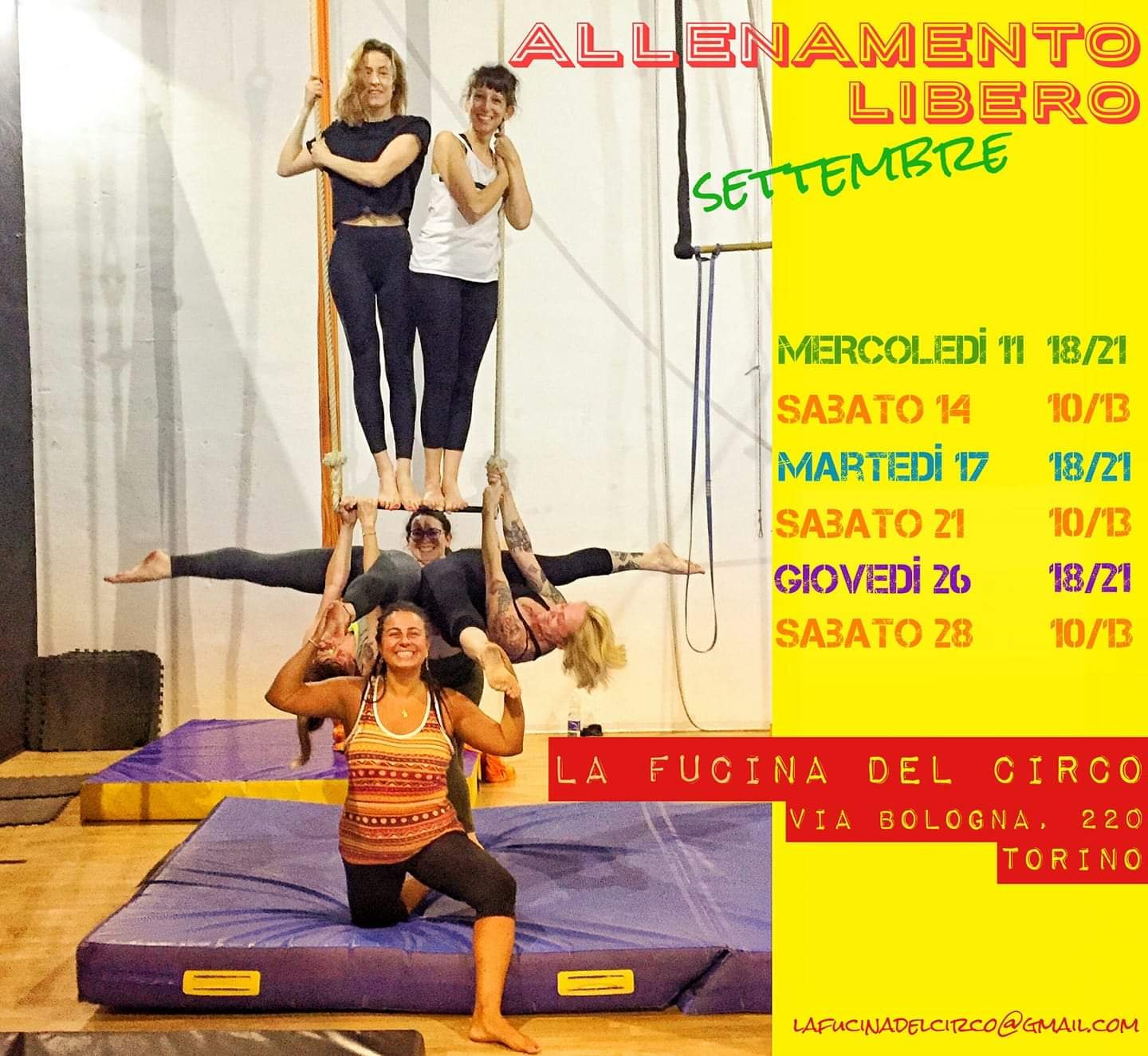 Laboratorio sperimentale di arti performative, scuola di circo, acrobatica aerea, corsi discipline aeree, spazio di creazione, spazio di allenamento.